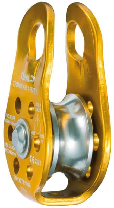 BEAL TRANSF’AIR FIXE B, POULIE SIMPLE A FLASQUES FIXES. Poulie compact polyvalente haut rendement. Poulie légère et compacte en aluminium. Conçue pour les mouflages et les déviations de charges. Axe sur roulement à billes. Pour cordes jusqu’à 13 mm de diamètre. Charge de rupture 22 kN. Poids : 120 g. EN 12278.