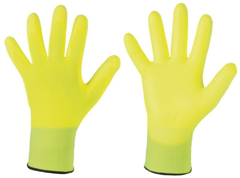 GANT PRECISION PU FLUORESCENT, MANUTENTION FINE, VOIRIE. Gant polyamide jaune fluo tricoté une pièce, jauge 13, enduction polyuréthane jaune fluo sur la paume et bouts des doigts. Poignet élastique. Taille 8 à 10. Activités : Risque de Microcoupures - Conditionnement à façon - Mécanique de précision - Manipulation fine en milieu sec - Assemblage de petites pièces - Industrie électronique - travaux sur voiries. Avantages : Excellente dextérité et préhension d’objets. Pour contacts secs. Facile à identifier ou à retrouver grâce à la couleur fluo.
