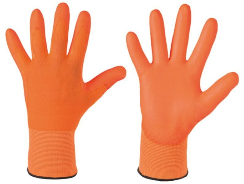 GANT PRECISION PU FLUORESCENT, MANUTENTION FINE, VOIRIE. Gant polyamide orange fluo tricoté une pièce, jauge 13, enduction polyuréthane orange fluo sur la paume et bouts des doigts. Poignet élastique. Taille 8 à 10. Activités : Risque de Microcoupures - Conditionnement à façon - Mécanique de précision - Manipulation fine en milieu sec - Assemblage de petites pièces - Industrie électronique - travaux sur voiries. Avantages : Excellente dextérité et préhension d’objets. Pour contacts secs. Facile à identifier ou à retrouver grâce à la couleur fluo.