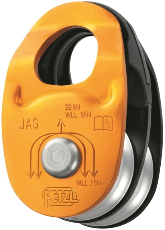 PETZL POULIE DOUBLE A FLASQUES MOBILES JAG. Poulie double à haut rendement.La poulie double JAG est destinée à être utilisée avec la poulie-bloqueur double JAG TRAXION pour réaliser un mouflage 4:1. Les réas sur roulement à billes étanche assurent un excellent rendement.
