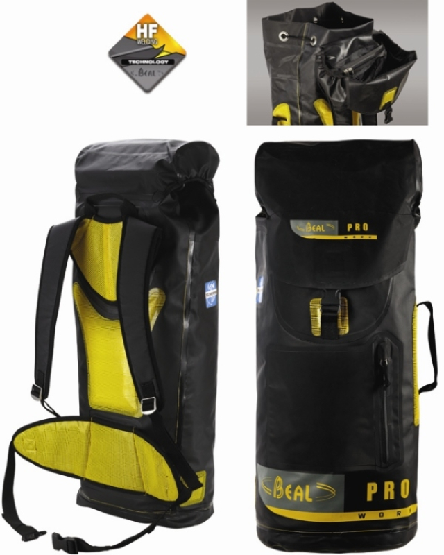 BEAL PRO WORK 45. SAC DE TRANSPORT 45 L. Adapté aux portages lourds. Poche extérieure étanche et grande poche sous rabat. Une fenêtre transparente. PVC biface ultra résistant. Soudure HF. Fond renforcé. Dos moussé ergonomique. Bretelles et ceinture confortables. Boucles de réglage en métal. Fenêtre d’identification. Poche extérieure étanche. Poignée de suspension. Poignée de transport latérale. Extérieur noir et intérieur jaune. Poids : 1525 g.